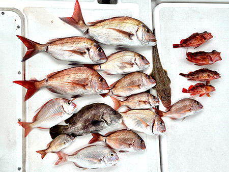 仕事の都合や悪天候など重なり、久々の出船になりました。暑さも和らぎ秋の気配が感じられる気持ち良い海でした。真鯛、青物狙いでしたが、途中風が強くなりポイント移動しながら何とか10数枚釣れました。針はずれやラインブレイクが多かったのが残念でした。青物のポイントには船団がありソナーにも反応がありましたが、ヒットしませんでした。これからの季節は期待大です!